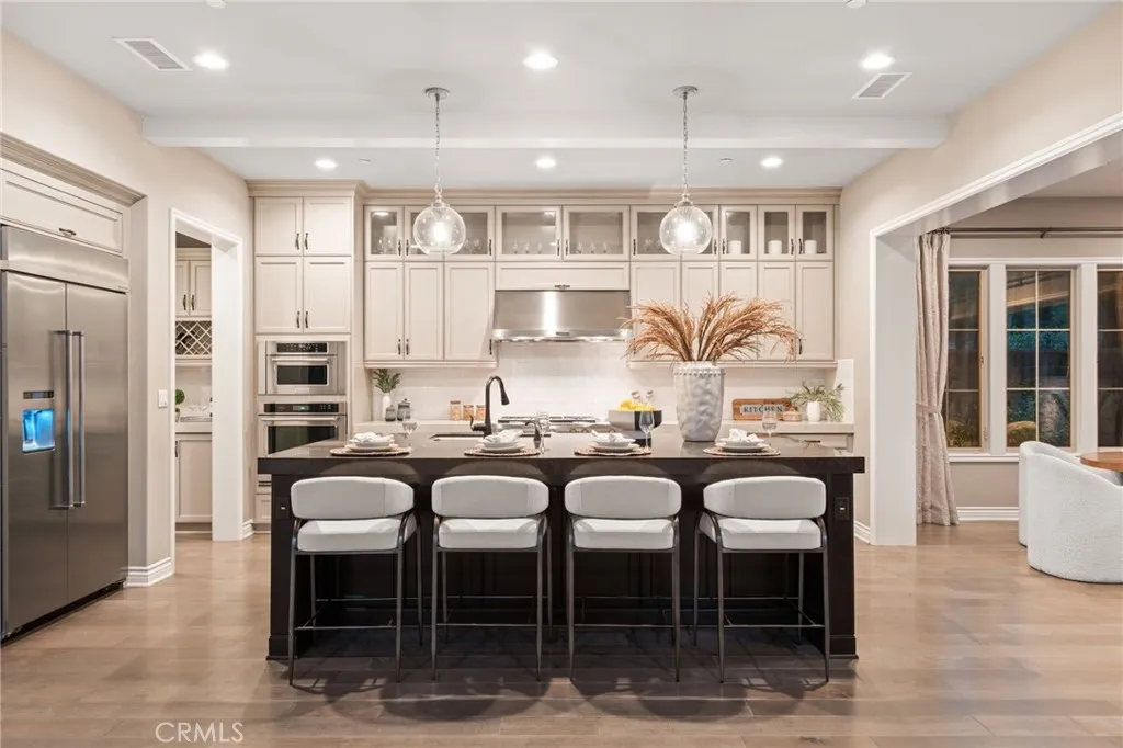 Welcome to Grove at Orchard Hills, a 24-hour guard-gated community in Irvine. This beautifully maintained residence offers 4 bedrooms and 5 bathrooms, featuring two dining areas, multiple living spaces, a fully equipped separate prep kitchen, and an attached 2-car garage, a functional layout designed for both comfortable daily living and effortless entertaining. Upon entry, a main-level bedroom suite with walk-in closet and private bath provides ideal flexibility for guests or multigenerational living. The home opens into a formal dining area, expansive great room, and gourmet kitchen centered around a large island; a separate prep kitchen adds additional cooking space and refrigeration, ideal for entertaining while maintaining a clean main kitchen. The second level functions as a private residential retreat thoughtfully designed for both comfort and practicality. The expansive primary suite serves as a serene sanctuary, featuring multiple windows that create a bright yet peaceful ambiance. The spa inspired primary bathroom includes dual vanities, a soaking tub, and a separate walk-in shower, while two oversized walk-in closets provide exceptional storage, organization, and dressing space rarely found in comparable homes. Two well appointed secondary bedrooms offer excellent natural light and comfortable proportions, including access to a private balcony that enhances airflow and indoor and outdoor continuity. A spacious central loft provides a flexible gathering area ideal for a secondary family room, media lounge, or study space, naturally connecting the upper level livin