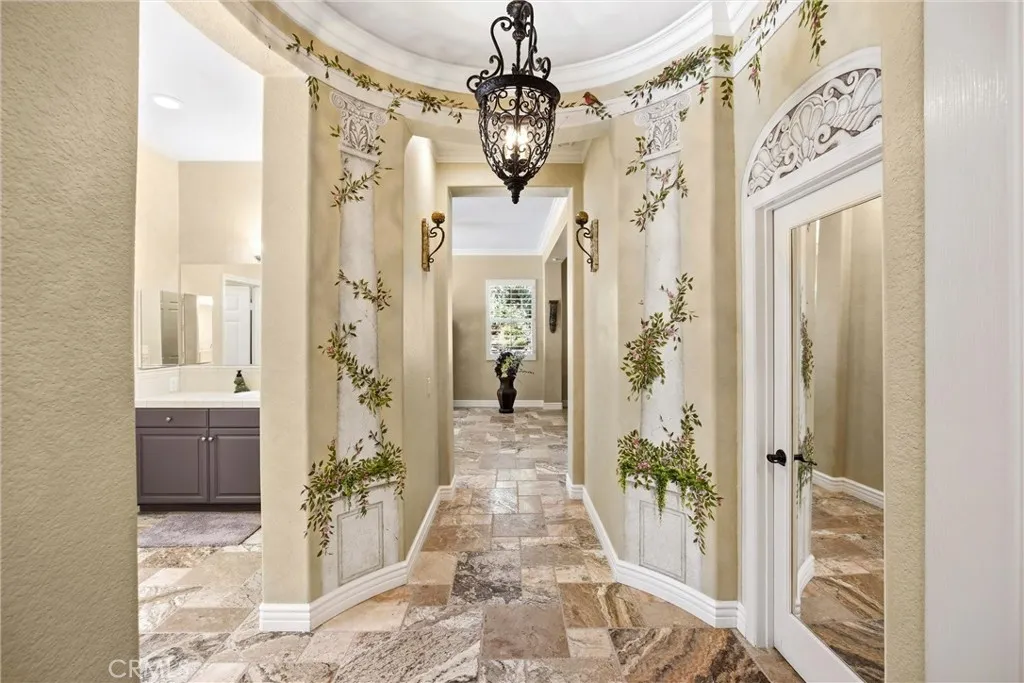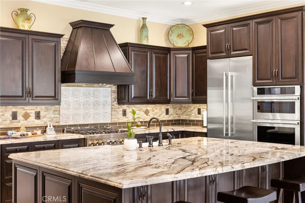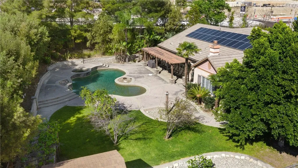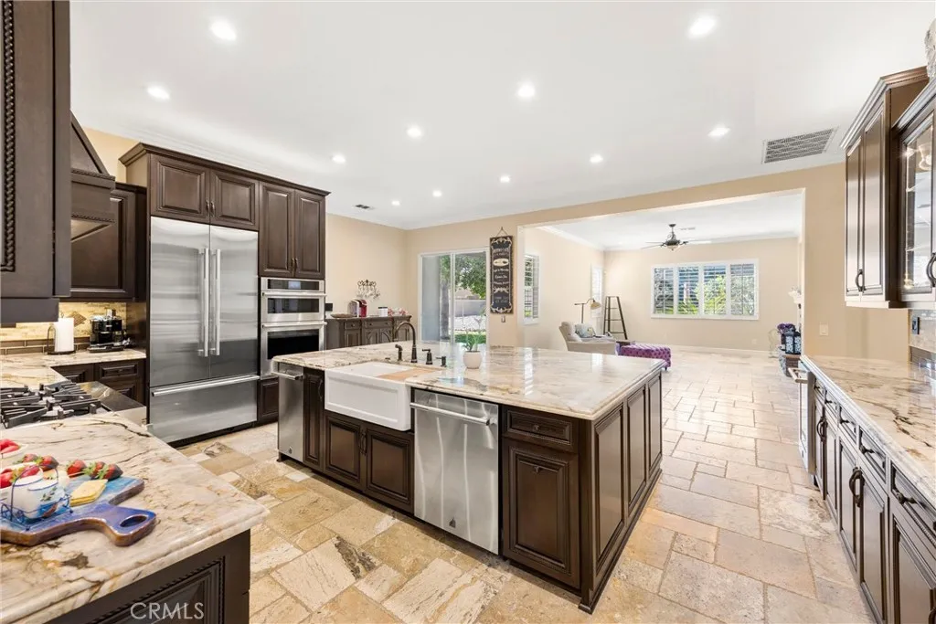 Welcome to your private resort in the highly sought-after Etiwanda Estates of Rancho Cucamonga. Situated on an expansive .62-acre lot in an award-winning school district, this stunning single-story estate offers 5 bedrooms, 3.5 bathrooms, a 4-car garage, RV parking, and a fully paid 12kW solar system the perfect blend of luxury, space, and lifestyle. Step inside to find beautiful travertine flooring throughout, crown molding, custom paint, recessed lighting, plantation shutters, and an abundance of natural light. The spacious floor plan features a formal living room, elegant dining room, and a large family room that opens seamlessly to the kitchen, making it ideal for entertaining. The chefs kitchen is the heart of the home and features a massive center island with granite countertops, extensive cabinetry, and high-end stainless steel appliances including a built-in refrigerator, oven, microwave, hood, dishwasher, and wine fridge. The oversized primary suite is a true retreat with a cozy fireplace, sitting area, private slider to the backyard, and an enormous walk-in closet. The luxurious primary bathroom offers dual vanity areas, a spacious walk-in shower, and a large soaking tub designed for relaxation. Additional bedrooms include a private ensuite bedroom, a Jack-and-Jill setup, and a fifth bedroom with high ceilings and recessed lighting. Step outside and experience your backyard oasis. The incredible pebble-tech pool and spa feature a rare beach-style entry and are surrounded by a large patio and covered entertaining area. The grounds include lush grass areas and mult