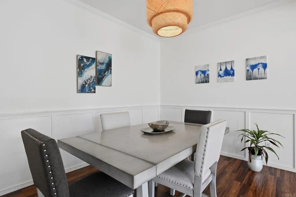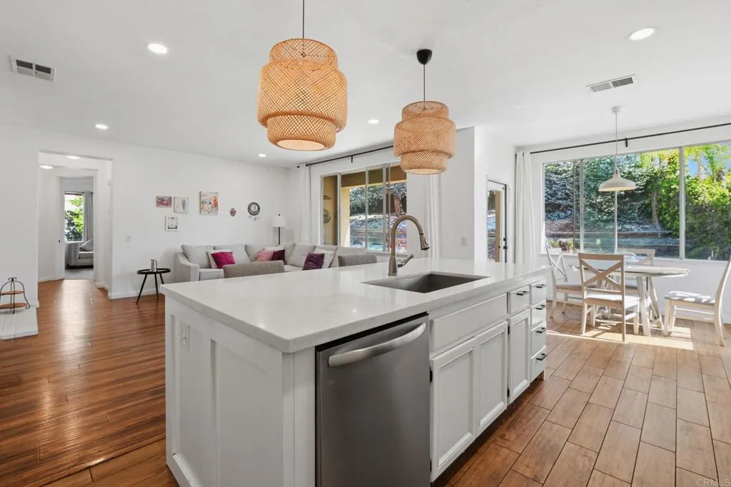 A formal entryway adorned with beautiful wainscoting welcomes you into this single-story, light-filled home, where coved archways and soaring ceilings create an elegant, airy feel. The spacious living room flows seamlessly into the formal dining area, perfect for both everyday living and entertaining. At the heart of the home, the open-concept kitchen and family room offer the ideal gathering space. The kitchen features crisp white cabinetry, quartz countertops, a large center island with bar seating, stainless steel appliances, a large basin sink, and a generous pantry. A sunny breakfast nook with backyard views adds to the charm. The adjacent family room is warm and inviting, complete with a white brick fireplace and a media niche with built-in shelving. A generously sized bonus room and nearby half bath provide flexibility and could easily be converted into an additional bedroom or private in-law suite. Secondary bedrooms are spacious and well-appointed. The expansive primary suite offers a relaxing retreat, featuring a dual-sink vanity, soaking tub, and a separate glass-enclosed shower. Additional highlights include a separate laundry room with ample storage, an attached 3-car garage, and a private backyard with a covered patio and terraced garden area, complete with mature landscaping and citrus trees. Ideally located on a quiet cul-de-sac, just minutes from local schools, shopping, dining, and with easy freeway access, this home offers the perfect blend of comfort, space, and convenience.