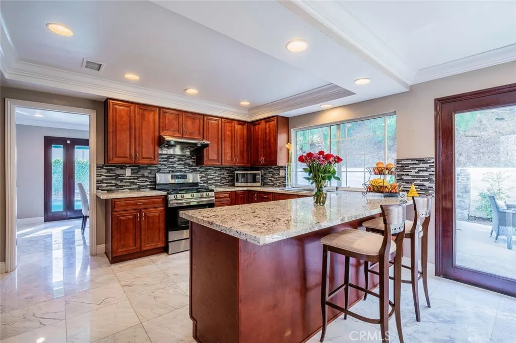 Beautifully updated Calabasas home located in the desirable Saratoga Hills community. This newly remodeled 4-bedroom, 3-bath residence features a spacious bonus room ideal for an office, media room, or playroom. Elegant marble tile and hardwood flooring run throughout the home. The remodeled kitchen offers granite countertops and opens to a generous family room with crown molding and French doors leading to the backyard. The grand living room showcases a vaulted ceiling and a classic brick, wood-burning fireplace, while the formal dining room features French doors with direct access to the poolperfect for indoor-outdoor entertaining. The primary suite is a true retreat, complete with a remodeled bathroom featuring dual vanities and two large walk-in closets. Additional highlights include an attached 3-car garage with 220V electric vehicle hookup. Enjoy a private, fenced backyard with a newly re-plastered pool and gray slate-stone trim. This energy-efficient home also includes a solar electric system. Located within the award-winning Las Virgenes School District, the Saratoga Hills neighborhood offers its own community park with a basketball court, volleyball court, playground, and picnic areas. Ideally situated near hiking and biking trails, and just a short drive to Malibu beaches and Pepperdine University. Unfurnished. Pool and gardening services included.